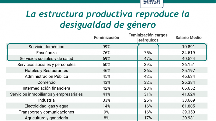 La presencia de mujeres dentro de las ramas económicas vinculadas al cuidado reproduce la división sexual del trabajo, mostrando tres actividades feminizadas: el servicio doméstico (98,5 por ciento), la enseñanza (75,6 por ciento) y los servicios sociales y de salud (69,3 por ciento). Contrariamente, los sectores más masculinizados son la construcción (3,1 por ciento), la agricultura, y ganadería (8, por ciento) y transporte y comunicaciones (8,7 por ciento) en tanto ámbitos considerados en el imaginario social como exclusivos del varón.