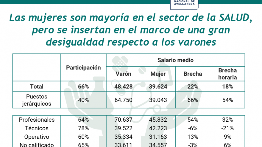 Por otra parte, en este contexto, es importante destacar la discriminación que sufren las mujeres en el sector de la Salud. A pesar de que ellas representan a 7 de cada 10 empleados en la actividad que hace frente al combate de la pandemia de la Covid-19, las mujeres sufren una gran discriminación laboral que se hace evidente no solo en el menor acceso a puestos de decisión sino también en la desigualdad salarial que se amplifica en los rangos de mayor jerarquía.