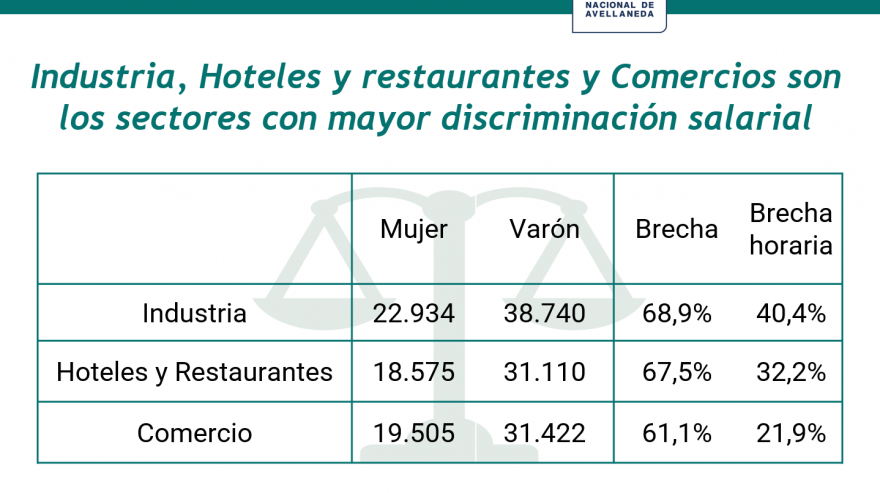 La desigualdad salarial tiene como principal fundamento las diferencias en la cantidad de horas trabajadas en el mercado laboral, resultado de la desigual distribución en las tareas domésticas y de cuidados no remuneradas realizadas mayoritariamente por mujeres. En todos los sectores, sin excepción, la cantidad de horas que trabajan las mujeres es menor a las realizadas por los varones. Las mayores diferencias se registraron en el sector de la Industria (15 horas), Agricultura y Ganadería (12 horas) y Construcción (12 horas).