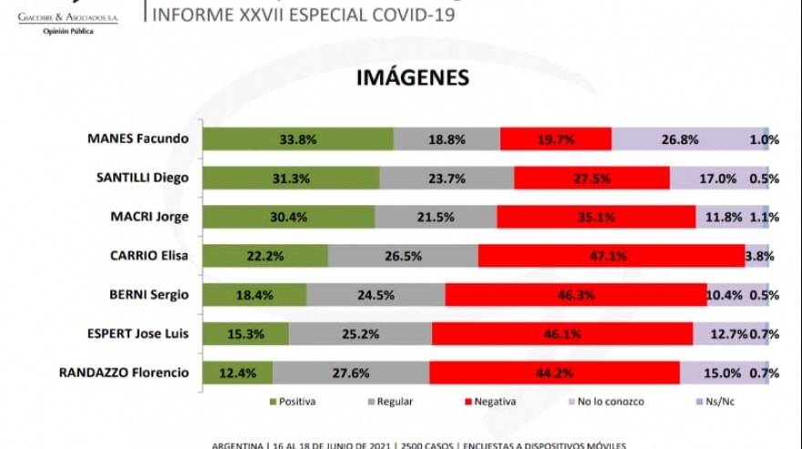 Manes se posiciona por sobre Diego Santilli, con una positiva de 31,3%, una negativa del 27,5% y un desconocimiento del 17%. Atrás le sigue Jorge Macri con una positiva del 30,4%, una negativa alta del 35,1%, más atrás viene Elisa Carrió con un 22,2% de positiva y un 47% de imagen negativa.