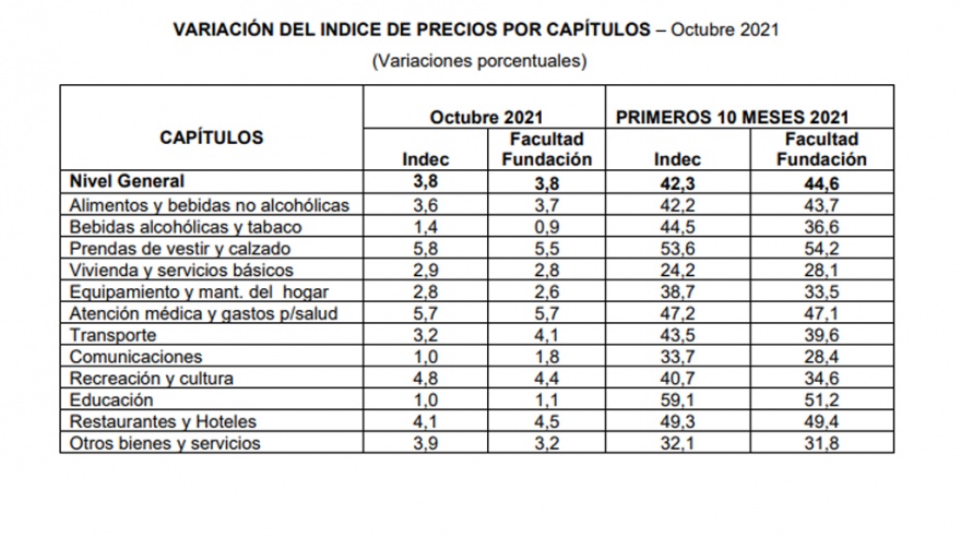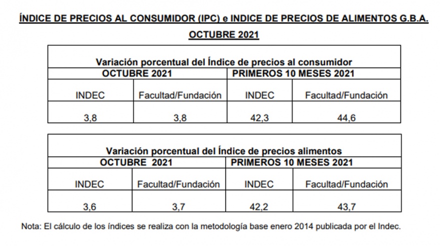 Los valores publicados por el Instituto de Estadística de la Ciudad de Buenos Aires son: octubre nivel general 3,7%; variación diez primeros meses de 40,2%. Variación interanual 49,9%. Variación en el precio de alimentos bebidas no alcohólicas octubre 2021 de 3,7%.