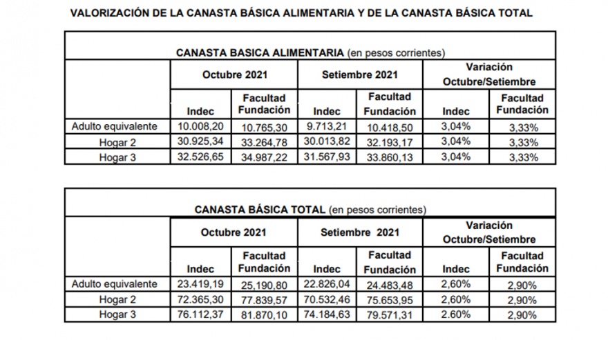 Los valores informados por la Ciudad de Buenos Aires, para el mes de octubre de 2021 para el hogar uno, compuesto por esposos de 35 años de edad y dos hijos varones de 9 y 6 años, son los siguientes: CBA $ 38.306,00 con una variación de 3,8% respecto de setiembre 2021 y CBT $ 72.601,00 con una variación de 3,6% respecto de setiembre 2021, en el informe se aclara que son propietarios de la vivienda.