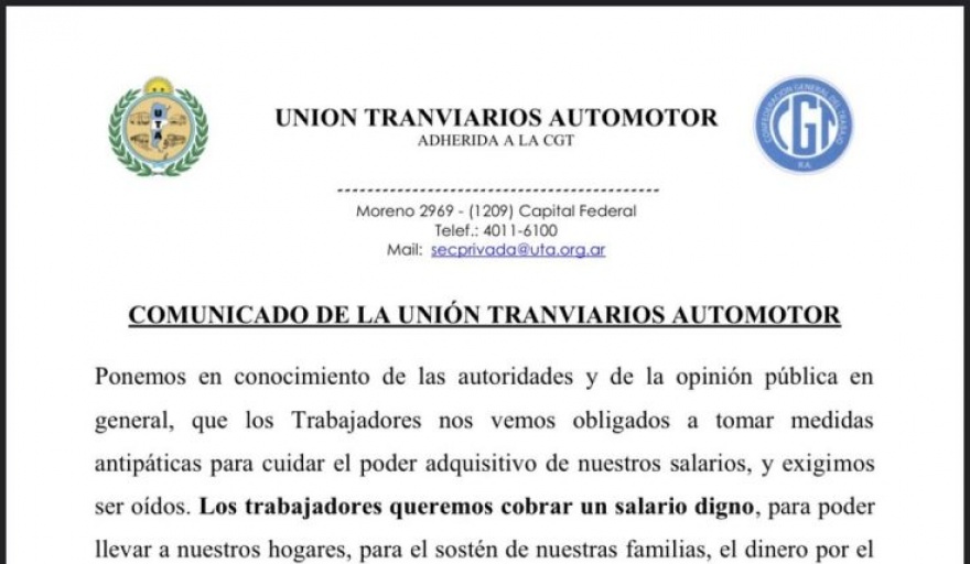 Anoche la conducción de la UTA, con Roberto Fernández a la cabeza, emitió un comunicado donde informó sobre los motivos de la huelga. Fernández, que recientemente inició el proceso pata renovar la conducción del gremio, aseguró que la organización "se ve obligada a tomar medidas antipáticas para poder cuidar los salarios y exigir ser oídos".