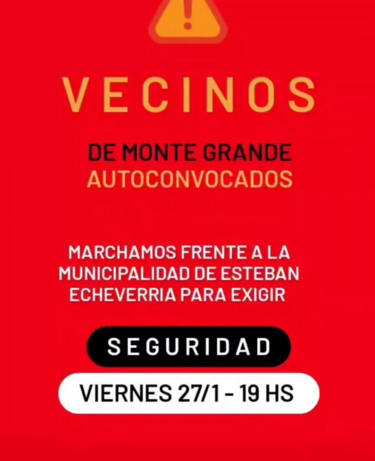 Vecinos autoconvocados se concentrarán este viernes a partir de las 19 en la Municipalidad de Esteban Echeverría para exigir mayor presencia policial en las zonas afectadas por la delincuencia.