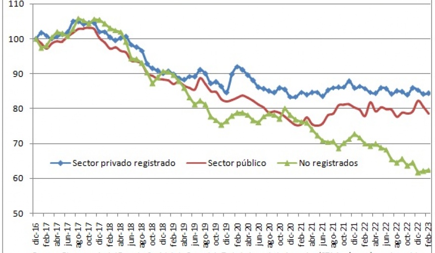 Que la informalidad gane terreno hace que muchos de estos nuevos empleados no estén en los convenios colectivos, que se vienen revisando intentando ganarle a la inflación. Si para los formales es muy difícil ganarle a la escalada de precios, para quienes están la economía popular –ya sean empleados en negro, cuentapropistas o monotributistas –la tarea es casi imposible. En este sentido, en su último reporte el Instituto de Estudios y Formación (IEF) afirmó que en las actuales condiciones “la conclusión parece bastante clara: el salario de los trabajadores registrados se viene defendiendo como puede, mientras que el de los no registrados se derrite”. En mayo, comparado con diciembre de 2019, “los trabajadores registrados del sector privado le empataron a la inflación; los del sector público perdieron un 4,4 por ciento y los no registrados un 18,4 por ciento”, recalcaron en la entidad, en un trabajo al que tuvo acceso Política de Sur.