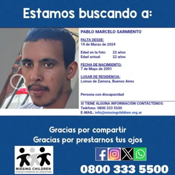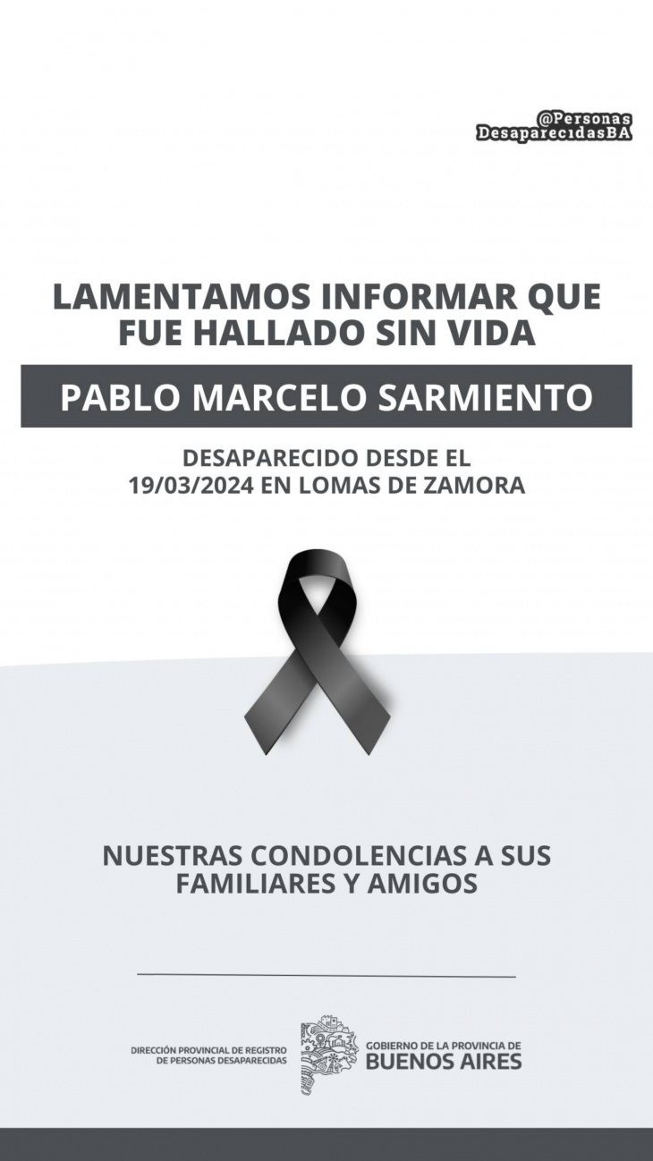 "Lamentamos informar que fue hallado sin vida Pablo Marcelo Sarmiento de la localidad de Lomas de Zamora, desaparecido desde el 19/03/2024", se lee en el texto, que agrega: "Nuestras condolencias a sus familiares y amigos".