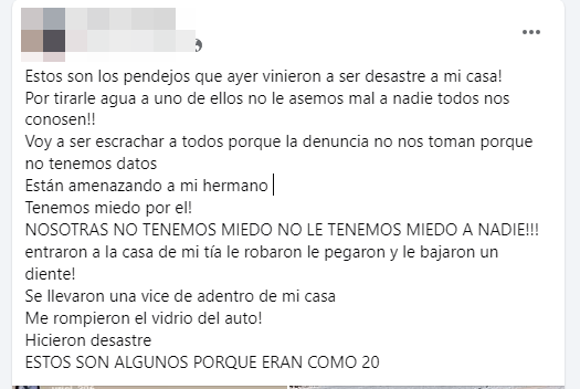 "Estos son los pendejos que ayer vinieron a ser desastre a mi casa. Por tirarle agua a uno de ellos no le hacemos mal a nadie, todos nos conocen", escribió la damnificada en su perfil de Facebook.