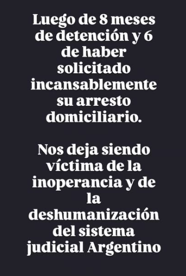 "Tras una semana de reclamos, la justicia nunca supo explicarnos lo que sucedió antes de que Sergio entrara en ese estado. Se habla de una descompensación en la unidad de traslado. No lo sabemos con exactitud. Lo que sí sabemos es que el juzgado de Garantías 4 de Avellaneda-Lanus es el responsable directo de que Sergio no haya podido tener un seguimiento médico adecuado", escribió la defensora.