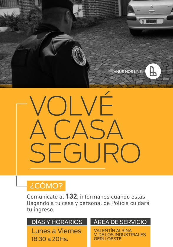 En el marco del programa “Volvé a Casa Seguro”, la Secretaría de Seguridad del Municipio de Lanús puso a disposición de los vecinos el número de emergencias 132, para que personal de la Policía Local custodie de lunes a viernes desde las 13.30 hasta las 20 el regreso a los hogares.