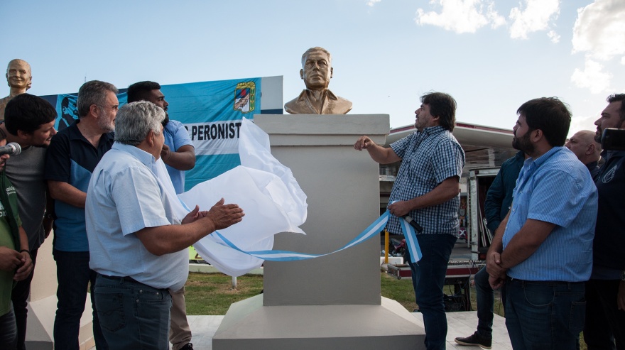 Las 62 Organizaciones Gremiales Peronistas de Almirante Brown realizaron ayer el acto de descubrimiento del busto del General Juan Domingo Perón en la localidad de Burzaco. El homenaje está emplazado en la rotonda conocida “Los Pinos”, junto a una efigie de Eva Duarte.