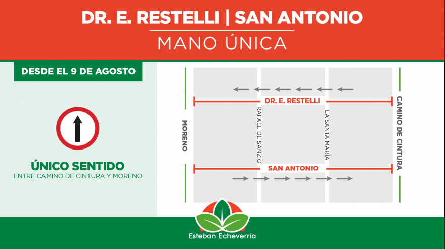 A partir de hoy comienza a regir el nuevo sentido de circulación con mano única en Restelli desde Camino de Cintura hacia Moreno, y San Antonio desde Moreno hacia Camino de Cintura, ambas en 9 de Abril.