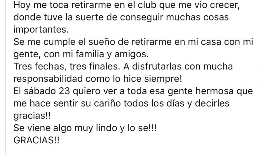 "Hoy me toca retirarme en el club que me vio crecer, donde tuve la suerte de conseguir muchas cosas importantes. Se me cumple el sueño de retirarme en mi casa con mi gente, con mi familia y amigos. Tres fechas, tras finales. A disfrutarlas con mucha responsabilidad como lo hice siempre!", expresó el goleador, quien palpitó el último encuentro de local: "El sabado 23 quiero ver a toda esa gente hermosa que me hace sentir su cariño todos los días y decirles gracias!".