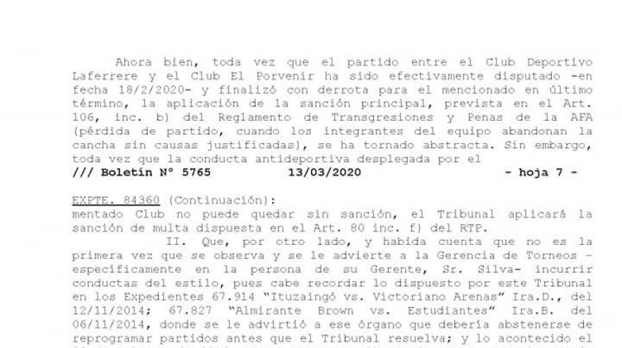 El fallo de la resolución del Boletin N°5765 del Tribunal de disciplina deportiva de AFA en su expediente 84244 resolvió la pérdida de puntos por abandono del equipo de El Porvenir en el partido ante Laferrere (la cual quedó abstracta por el hecho de que el conjunto de Gerli perdió el partido a posteriori con la programación, en principio dudosa, del encuentro). La duda es saber que hubiera pasado si El Porvenir ganaba o empataba el partido que finalmente Laferrere ganó en la cancha por 2 a 1. Nadie lo sabe.