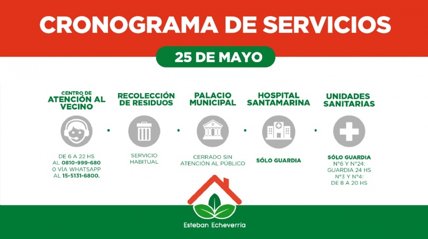 El Municipio de Esteban Echeverría informó la grilla de atención de los servicios de salud y del Centro de Atención al Vecino (CAV), así como también recuerda el cronograma de recolección de residuos para el feriado del lunes 25 de mayo.