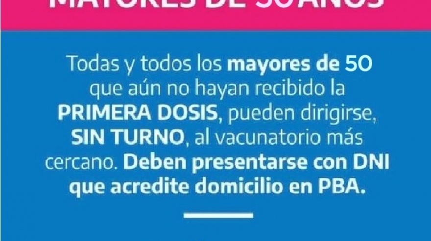 El intendente de Almirante Brown, Mariano Cascallares, anunció que por decisión del gobierno bonaerense, "desde este sábado 26 de junio, las vecinas y los vecinos mayores de 50 años podrán presentarse en cualquier vacunatorio cercano para recibir la primera dosis sin inscripción previa y unicamente presentando el DNI que acredite domicilio en la Provincia".