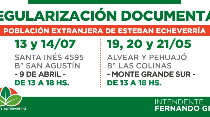 En el marco del plan de Regularización Documental, el Municipio de Esteban Echeverría realiza operativos de 13 a 18 horas en distintos puntos del distrito con el fin de asistir a la población extranjera del distrito en la obtención de su documentación.