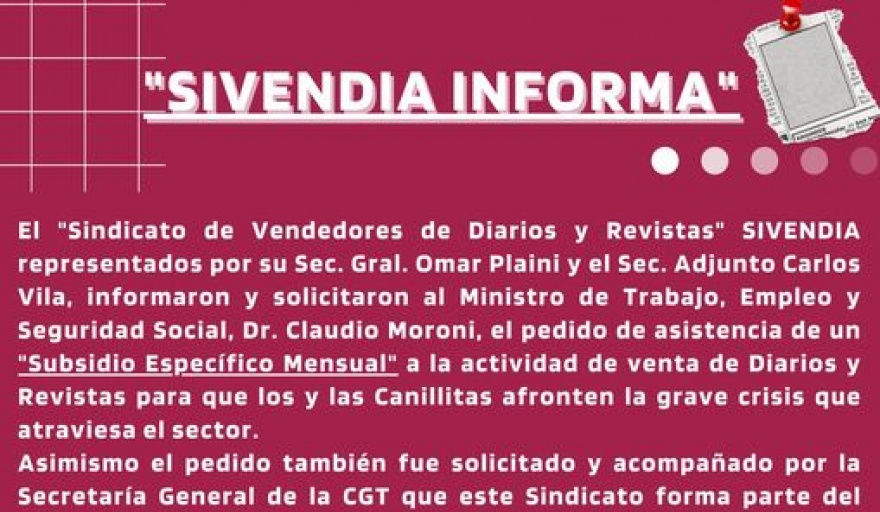 Lo confirmó Omar Plaini, dirigente del Sindicato de Canillitas, luego de un encuentro con el ministro de Trabajo Claudio Moroni, donde analizaron los problemas que afronta la actividad.