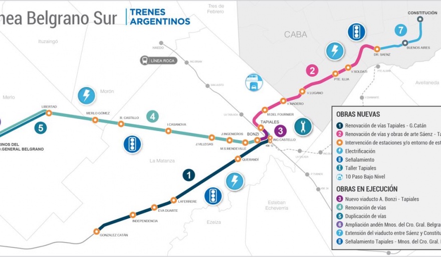 Según se informa oficialmente, el proyecto busca modernizar la Línea Belgrano Sur a través de renovación de vías y aparatos de vías de los ramales faltantes: Ramal G entre Tapiales y González Catán y sectores a completar entre Sáenz y Tapiales, mejoras en estaciones existentes, mejoras en los entornos de las estaciones, electrificación de la Línea desde la futura cabecera de Plaza Constitución hasta González Catán (Ramal G) y hasta Marinos del Crucero General Belgrano (Ramal M), mejoras en puentes y alcantarillas y señalamiento.