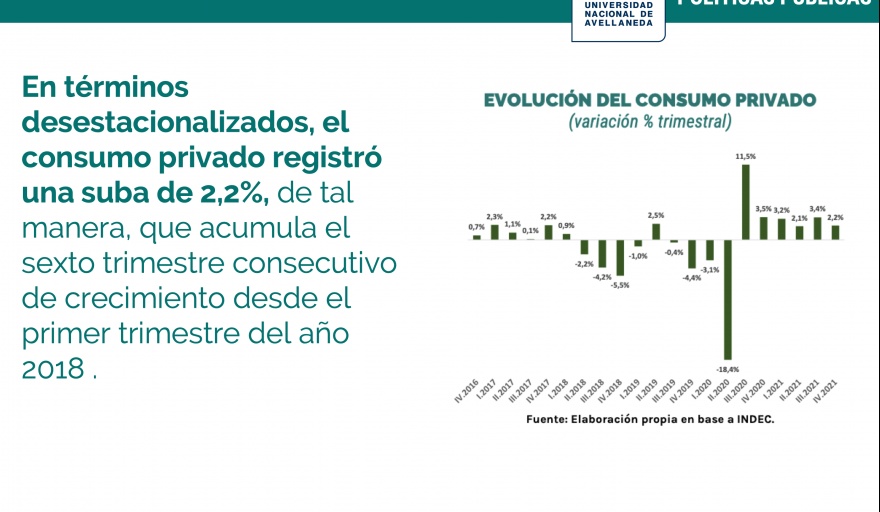 En el cuarto trimestre del 2021, la trayectoria del consumo privado en términos desestacionalizados consolidó su tendencia alcista, puesto que registró una suba de 2,2%, de tal manera, que acumula el sexto trimestre consecutivo de crecimiento desde el primer trimestre del año 2018.