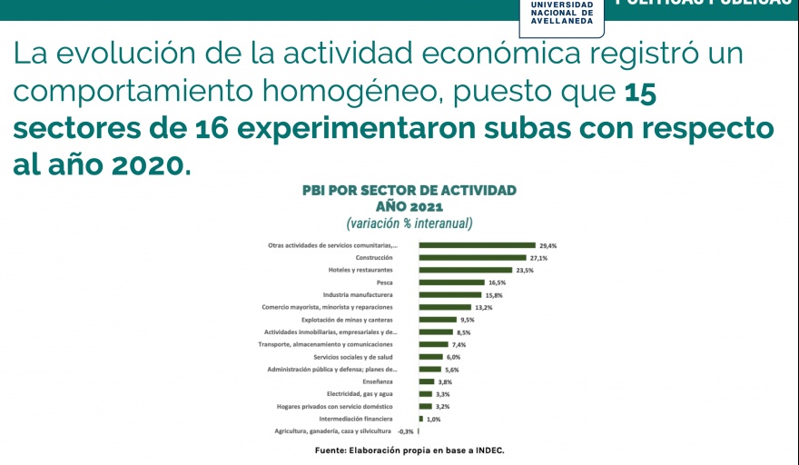 La evolución de la actividad económica registró un comportamiento regular, puesto que 15 sectores de 16 experimentaron subas con respecto año 2020. El único rubro que presentó una baja interanual fue Agricultura, ganadería, caza y silvicultura (0,3%). Por otro lado, los sectores que presentaron mayores subas interanuales fueron Otras actividades de servicios comunitarios, sociales y personales, Construcción, Hoteles y restaurantes y Pesca con 29,4%, 27,1%, 23,5% y 16,5% respectivamente.
