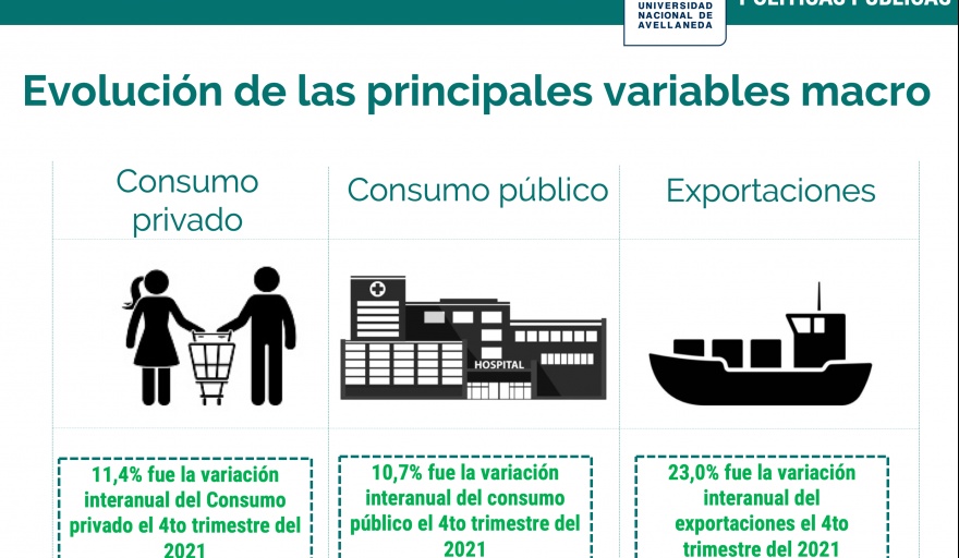 En el cuarto trimestre del año 2021, los componentes de la demanda agregada en relación con el mismo período del año 2020 arrojan trayectorias homogéneas, puesto que el Consumo Privado y el Consumo Público avanzaron 11,4% y 10,7% respectivamente. Análogamente, la FBCF se expandió un 13,0%, mientras que las Importaciones crecieron un 20,5%. Por último, las Exportaciones aumentaron interanualmente un 23,0%.