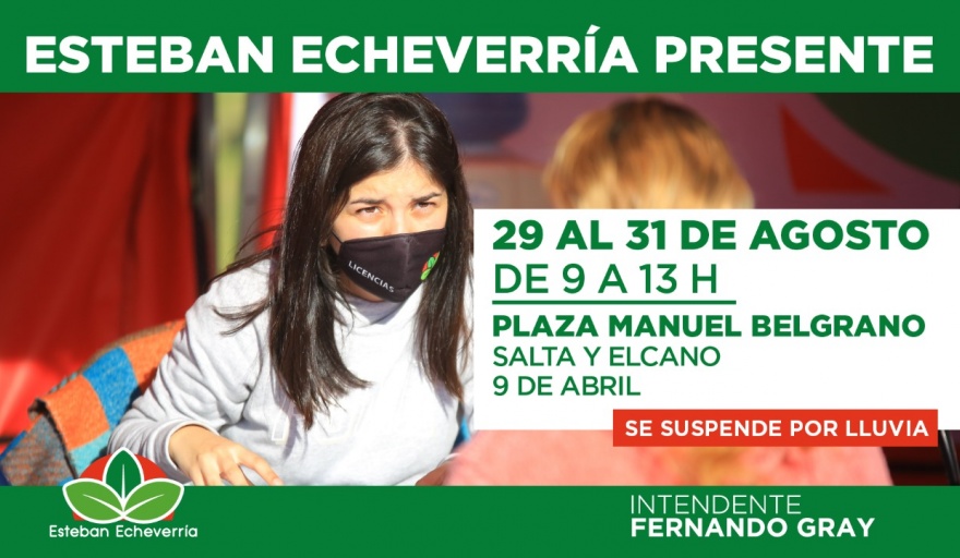 Destinado a descentralizar la atención y facilitar a las vecinas y a los vecinos la realización de trámites, desde este lunes y hasta el miércoles el Municipio realizará un nuevo operativo del programa Esteban Echeverría Presente en la plaza General Belgrano, ubicada en Salta y Elcano en 9 de Abril, de 9 a 13 horas.