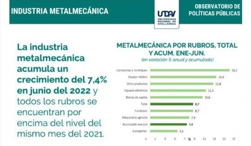 Con respecto a la industria metalmecánica, para el mes de junio del 2022, la variación interanual del índice general de actividad reportado por ADIMRA, muestra una mejora del 8,7%. A su vez, en el acumulado desde enero hasta junio del corriente año, en comparación con el año 2021, la mejora alcanza el 7,4%.