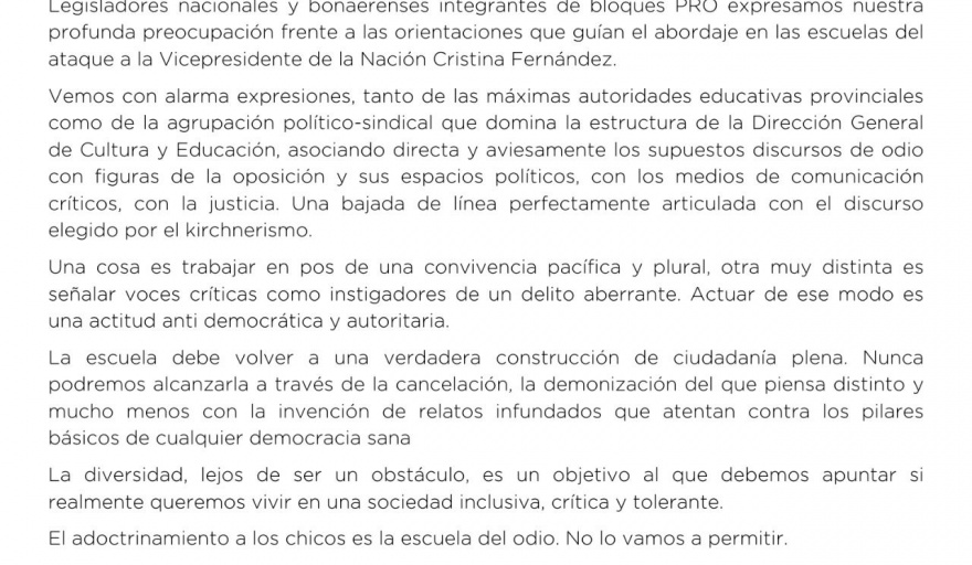 “Vemos con alarma expresiones, tanto de las máximas autoridades educativas provinciales como de la agrupación político-sindical que domina la estructura de la Dirección General de Cultura y Educación, asociando directa y aviesamente los supuestos discursos de odio con figuras de la oposición y sus espacios políticos, con los medios de comunicación críticos, con la justicia. Una bajada de línea perfectamente articulada con el discurso elegido por el kirchnerismo”, criticaron desde el PRO a través de un comunicado.