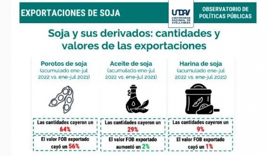 Analizando las exportaciones de los productos de soja, durante lo que va del año 2022 se registra una importante caída. Respecto de las cantidades, para el período ene-jul 2021 las exportaciones de porotos de soja cayeron un 64%, las de aceite de soja un 29% y las de harina de soja un 9%.
