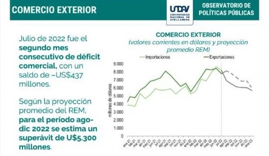El saldo mensual de la balanza comercial, luego de mantener saldos positivos alrededor de los U$S1.400 millones mensuales entre enero y octubre de 2021, desde noviembre de ese año se redujo considerablemente hasta presentar saldos negativos en junio y julio del 2022 por -US$ 231 millones y -US$ 437 millones respectivamente. Las estimaciones promedio del Relevamiento de Expectativas de Mercado (REM) arroja una rápida reversión del signo de la Balanza Comercial desde agosto hasta al menos enero de 2023.