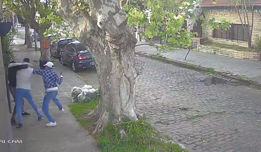 El episodio de violencia ocurrido en Quirno Costa y Ramón Franco de la localidad de Escalada quedó filmado por una cámara de seguridad particular que registró el momento en el que el vecino llega al lugar y es abordado instantes posteriores a descender del vehículo por dos jóvenes que primero tratan de amedrentarlo, para luego empezar la terrible agresión.