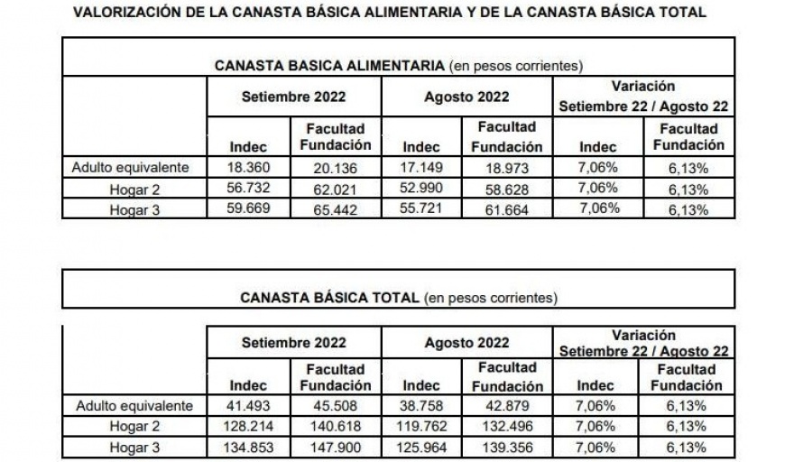 Los valores informados por la Ciudad de Buenos Aires, para el mes de septiembre de 2022 para el hogar uno, compuesto por esposos de 35 años de edad y dos hijos varones de 9 y 6 años, son los siguientes: CBA $ 70.234 con una variación de 6,8% respecto de agosto 2022 y CBT $ 128.838 con una variación de 6,3% respecto de agosto 2022, el informe aclara que son propietarios de la vivienda.
