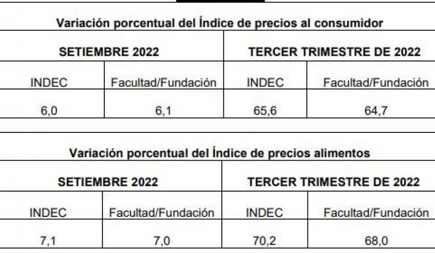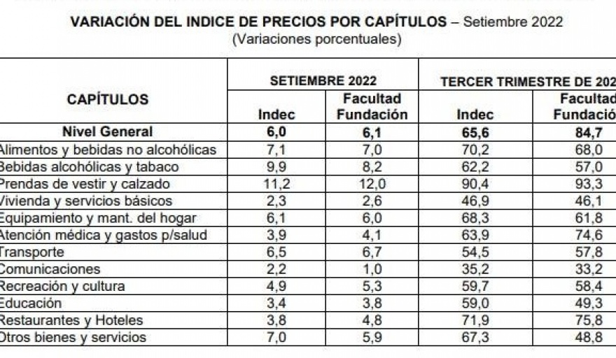 Los valores publicados por el Instituto de Estadística de la Ciudad de Buenos Aires son: Septiembre 2022 Nivel general 5,6%; variación primeros tres trimestres: 61,6% variación interanual: 78,4%. Variación en el precio de alimentos bebidas no alcohólicas septiembre 2022: 7,1%.