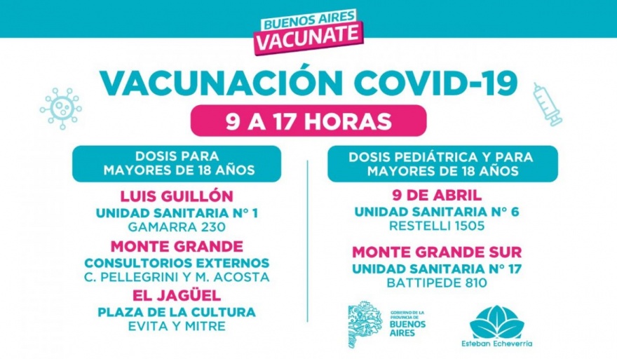 El Municipio de Esteban Echeverría continúa con la campaña para evitar contagios de Covid-19 por lo que las personas que quieran completar sus esquemas de vacunación podrán hacerlo en cualquiera de las cinco postas ubicadas en el distrito.