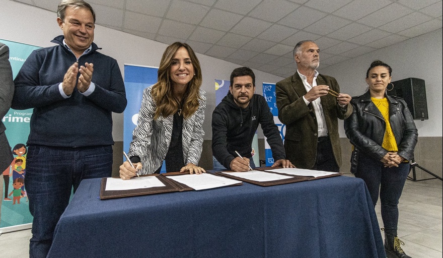 La ministra de Desarrollo Social de la Nación, Victoria Tolosa Paz, junto a Mariano Cascallares y al intendente interino de Almirante Brown, Juan Fabiani, firmaron convenios para potenciar las políticas públicas vinculadas a los derechos y el desarrollo de la niñez y la adolescencia.