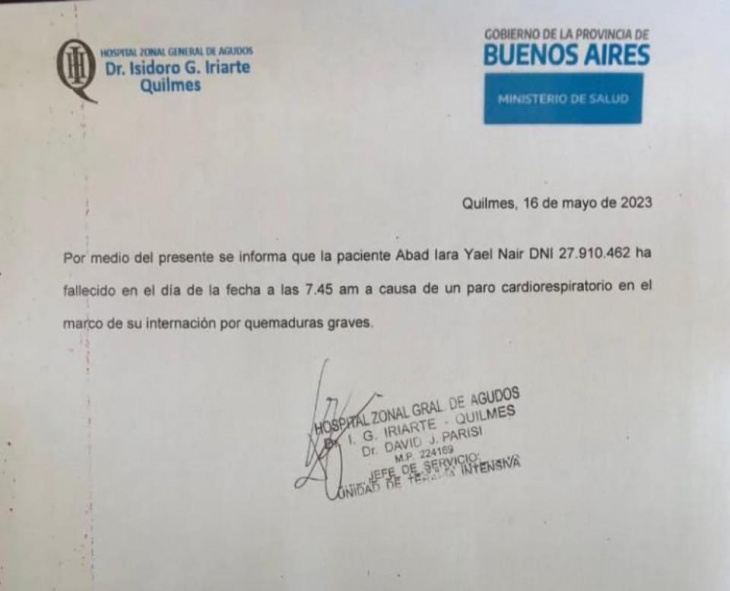 "Por medio de la presente se informa que la paciente Abad Iara Yael Nair ha fallecido en el día de la fecha a las 7.45 a causa de un paro cardiorespiratorio en el marco de su internación por quemaduras graves", señala el parte médico difundido por las autoridades del centro de salud.