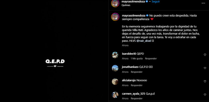 Por su parte, la intendenta de Quilmes, Mayra Mendoza, realizó una publicación para despedirla en la que destacó "los años de caminar juntas. Nos dejas el desafío de, una vez más, transformar el dolor en lucha, en fuerza para seguir con la tarea. Te voy a extrañar en cada paso".
