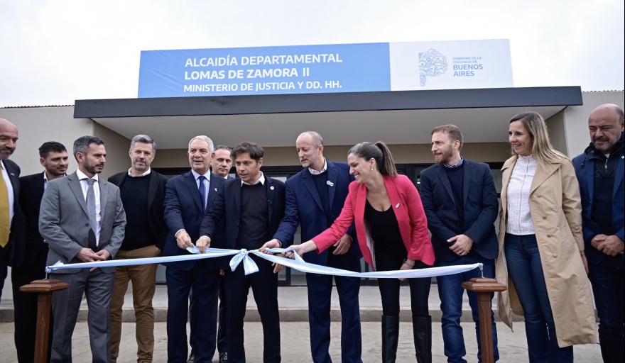 El gobernador bonaerense, Axel Kicillof, encabezó este martes el acto de inauguración de la Alcaidía de Lomas de Zamora, junto al jefe de Gabinete provincial e intendente en uso de licencia, Martín Insaurralde; el ministro de Justicia y Derechos Humanos, Julio Alak; y la directora provincial de Alcaidías Departamentales, Paula Montero.