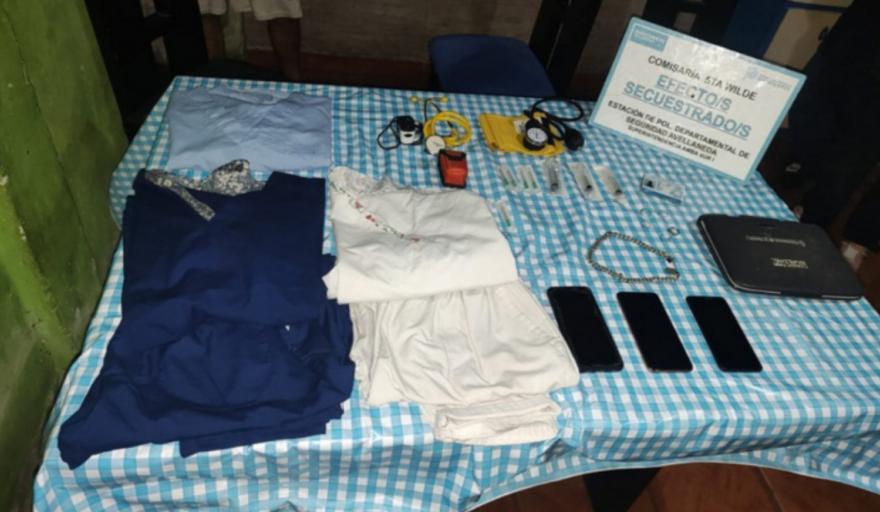 Durante los allanamientos se secuestraron una notebook, tres teléfonos celulares, indumentaria utilizada para tareas de enfermería (entre ellos un ambo, un estetoscopio, un tensiómetro y jeringas) y varios accesorios de bijouterie.