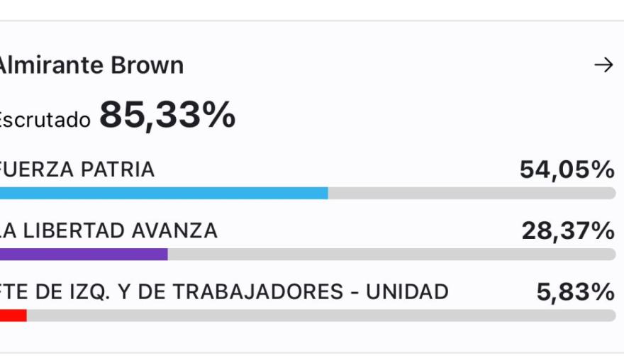 En Almirante Brown, hubo otro fuerte espaldarazo a Fuerza Patria. Allí, la candidata a concejal Paula Eichel ganó con el 57,90 por ciento contra el 23,55 de los violetas.