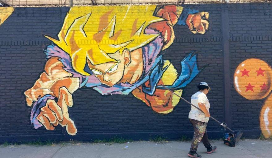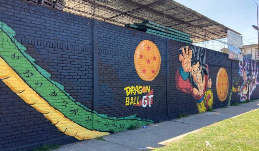 El mural representa a Goku en distintas transformaciones, al dragón Shen Long y a las esferas del dragón, íconos centrales del universo creado por Akira Toriyama.