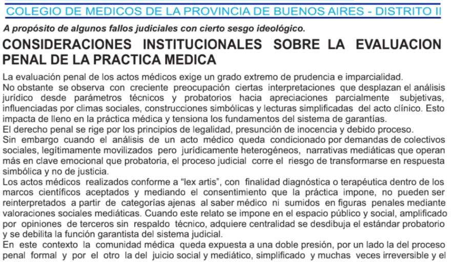 En uno de los pasajes más fuertes, el Colegio de Médicos Distrito II, con sede en Avellaneda, plantea que cuando los fallos judiciales se ven condicionados por demandas sociales o por la presión de la opinión pública, “el proceso judicial corre el riesgo de transformarse en una respuesta simbólica y no de justicia”.