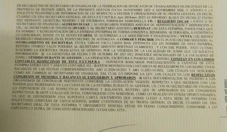 La carta documento supuestamente enviada por Ruggiero al actual secretario general, Walter Leonardi, habla de una venta realizada hace cinco años que hoy vuelve como un boomerang y amenaza con comprometer a la conducción actual. El inmueble vendido era una sede sindical en Junín, escriturada a nombre de la Federación provincial. La pregunta es simple y brutal: ¿quién autorizó la venta y bajo qué condiciones?