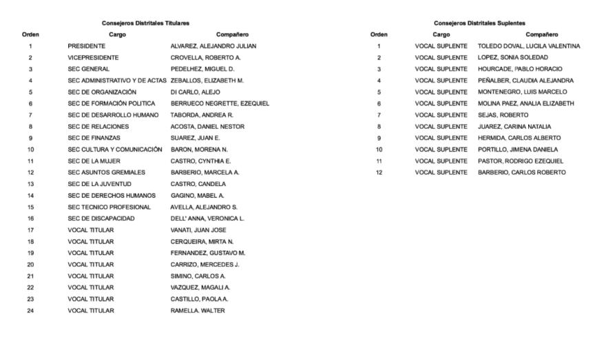 Asimismo, Cynthia E. Castro ocupará la Secretaría de la Mujer, Marcela A. Barberio la Secretaría de Asuntos Gremiales, Candela Castro la Secretaría de la Juventud, Mabel A. Gagino la Secretaría de Derechos Humanos, Alejandro S. Avella la Secretaría Técnico Profesional y Verónica L. Dell’Anna la Secretaría de Discapacidad. Completan el listado de vocales titulares Juan José Vanati, Mirta N. Cerqueira, Gustavo M. Fernández, Mercedes J. Carrizo, Carlos A. Simino, Magali A. Vázquez, Paola A. Castillo y Walter Ramella.