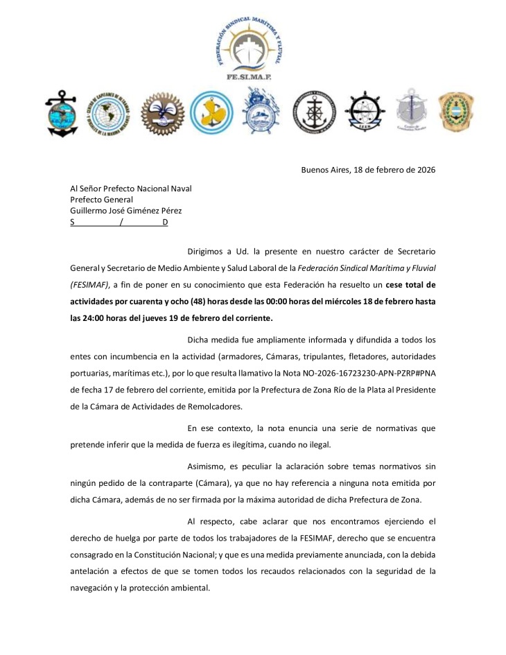 Las organizaciones sindicales que integran la Federación Sindical Marítima y Fluvial decretaron un paro de 48 hs que inició este miércoles a las 00 hs y finalizará el día viernes 19 de febrero a las 00 hs. “Esta medida de fuerza tiene como objetivo defender nuestros derechos laborales, la estabilidad de nuestros puestos de trabajo y la dignidad de la familia marítima/fluvial frente a iniciativas que buscan precarizar nuestra actividad”, expresó el comunicado de la FE.SI.MA.F.