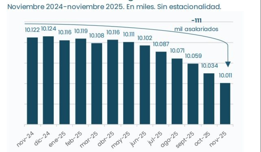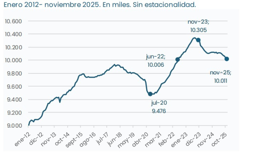 Según los datos desestacionalizados del Sistema Integrado Previsional Argentino (SIPA), en noviembre había aproximadamente 10.010.000 de trabajadores asalariados registrados en la seguridad social, incluyendo empleo privado, público y en casas particulares. El informe describe una trayectoria descendente que se profundizó en los últimos meses.