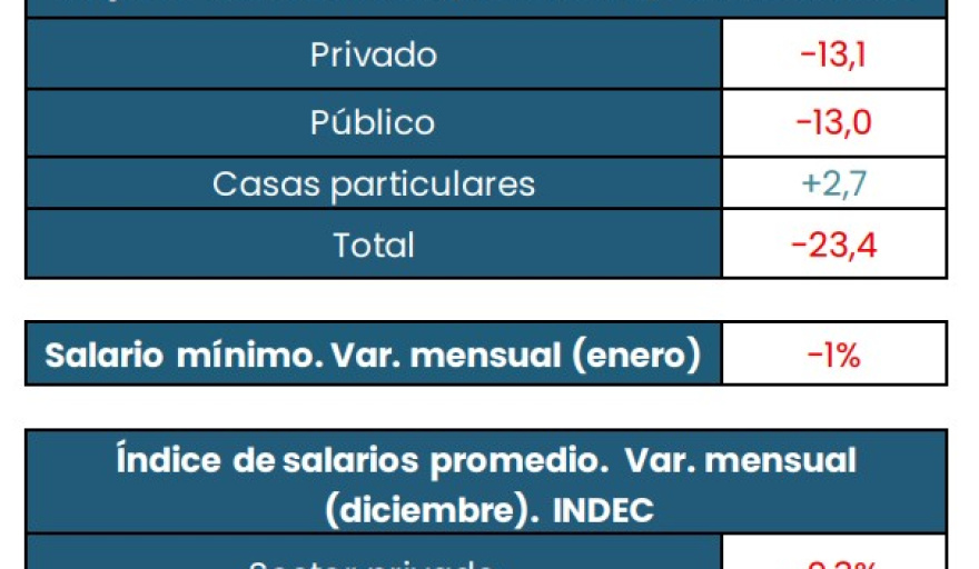 A su vez, en diciembre de 2025 el salario promedio real —medido por el Índice de Salarios del Instituto Nacional de Estadística y Censos (INDEC)— se redujo 0,3 por ciento en el sector privado registrado y 1,8 por ciento en el sector público, en términos mensuales, precisó el informe. Estas variaciones se suman a una secuencia de retrocesos en los meses previos: -0,9 por ciento en diciembre; -0,5 por ciento en noviembre; -2,3 por ciento en octubre; -2,0 por ciento en septiembre; -0,5 por ciento en agosto y -0,5 por ciento en julio.