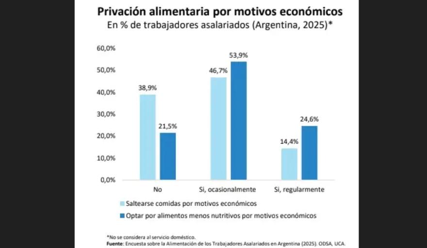 En el caso de los empleados argentinos, “se volvió un fenómeno extendido, con recortes tanto en la cantidad como en la calidad de los alimentos consumidos durante la jornada laboral”, según el reporte, al que tuvo acceso Política del Sur. Según la investigación, “apenas el 16,5 por ciento de los asalariados está libre de privaciones alimentarias. En contraste, el 83,5 por ciento experimenta algún tipo de vulnerabilidad, lo que refleja el deterioro del poder adquisitivo en un contexto de inflación persistente.