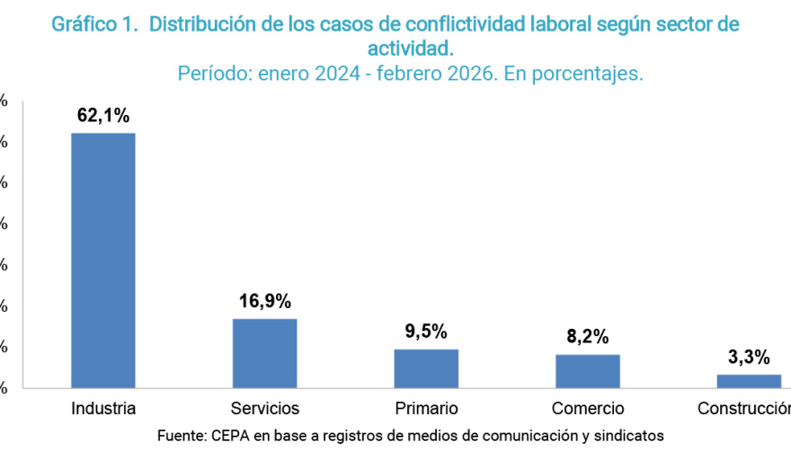 Desde la elección de 2025 los conflictos no se detuvieron, afirma CEPA, sino que se recrudecieron y se registraron al menos 510 casos en todo el país. Del total, el 67,1 por ciento estuvo ligado a la Industria (principalmente sector textil, alimenticio, automotriz y metalúrgica y siderúrgica), seguido de comercio (14,3 por ciento), servicios (11,9 por ciento), construcción (3,8 por ciento) y sector primario (2,9 por ciento).